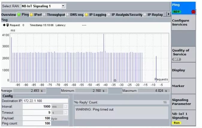 圖7 NB-IoT 的數(shù)據(jù)應(yīng)用模式連接下,從 CMW500 向終端發(fā)起 PING測(cè)試,可見 PING 時(shí)延在 2 秒以上,符合 NB-IoT 低速連接的技術(shù)特點(diǎn)