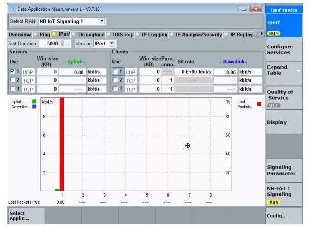 圖8 數(shù)據(jù)應(yīng)用連接下的Iperf灌包測(cè)試,可見左側(cè)具有極低的綠色上行速度,表明CMW500接收到了終端發(fā)出的UPD數(shù)據(jù)包